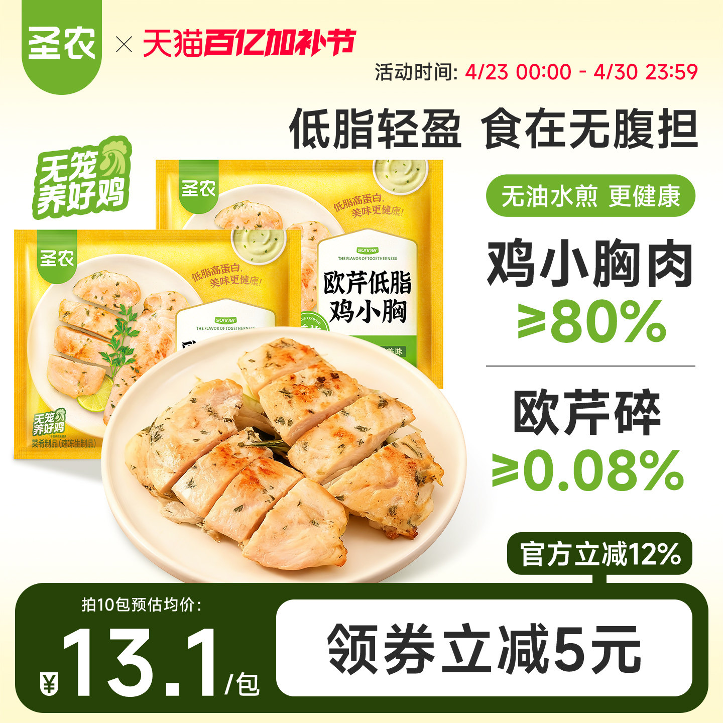 圣农欧芹鸡里脊300g*5包低脂高蛋白水煎鸡胸肉健身代餐轻食鸡排