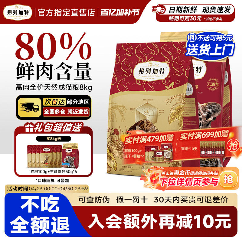 弗列加特猫粮80%鲜肉粮8kg鸡肉乳鸽0压乳无谷猫粮烘焙粮7.2kg囤货