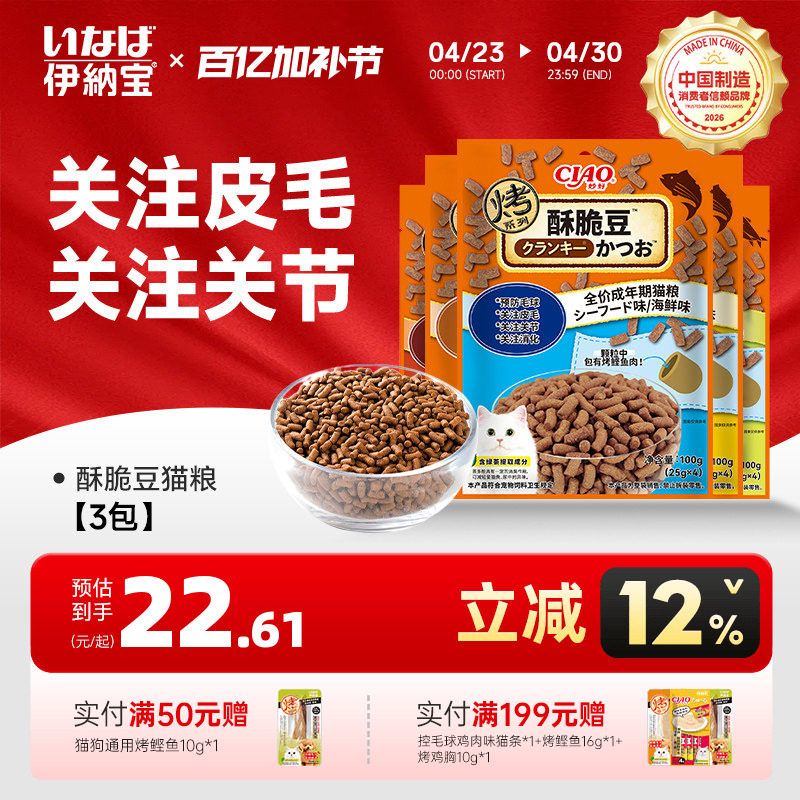 伊纳宝猫零食鲣鱼肉猫咪专用鸡肉鱼肉猫粮酥脆豆ciao全价成猫粮