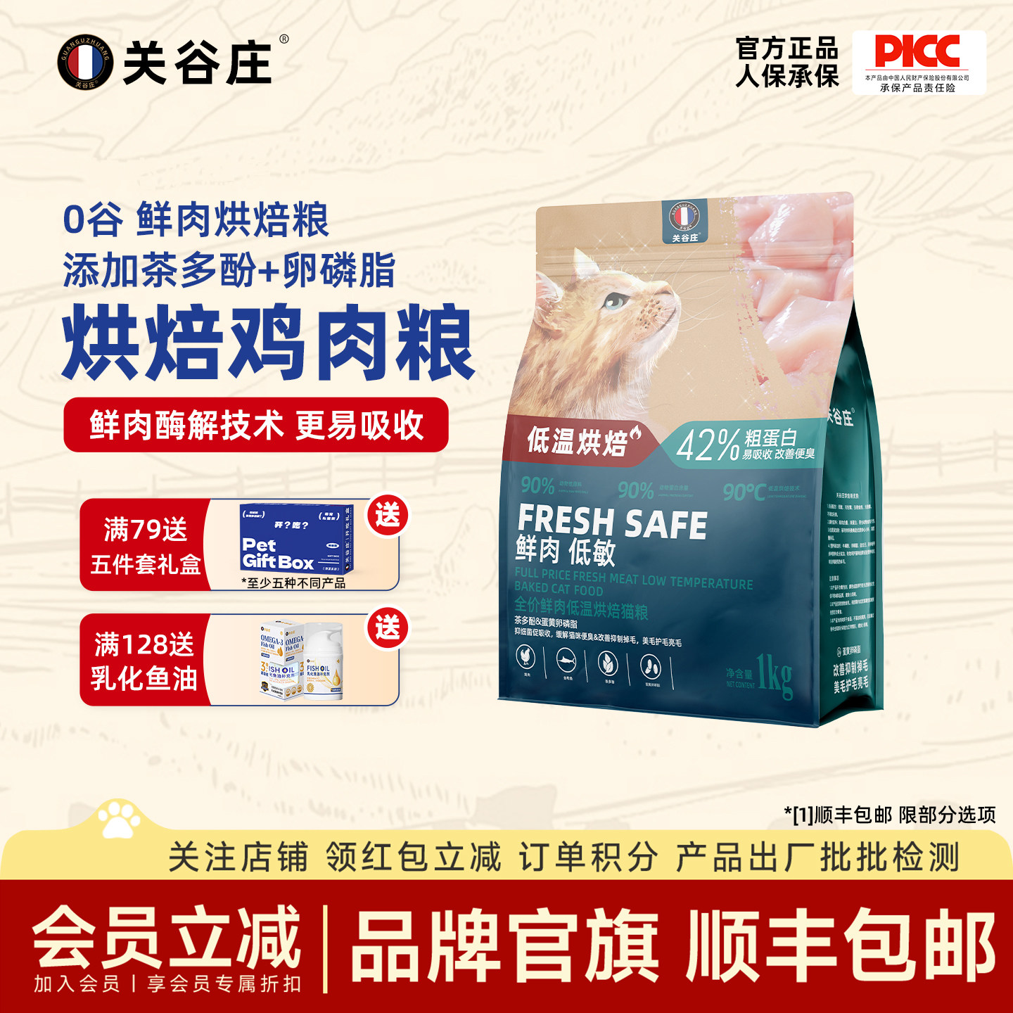 关谷庄鸡肉低温烘焙猫粮无谷幼猫成猫全价猫粮营养低敏高肉1kg/袋