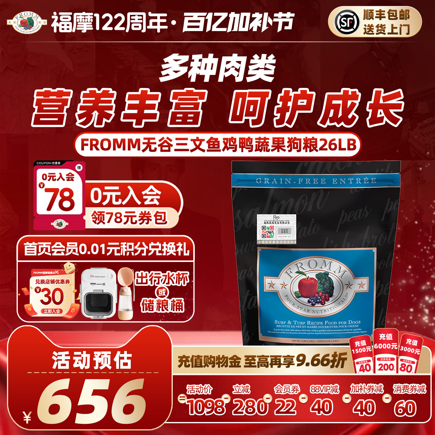 【官方旗舰店】福摩FROMM无谷三文鱼鸡鸭肉蔬果成幼犬狗粮11.8KG