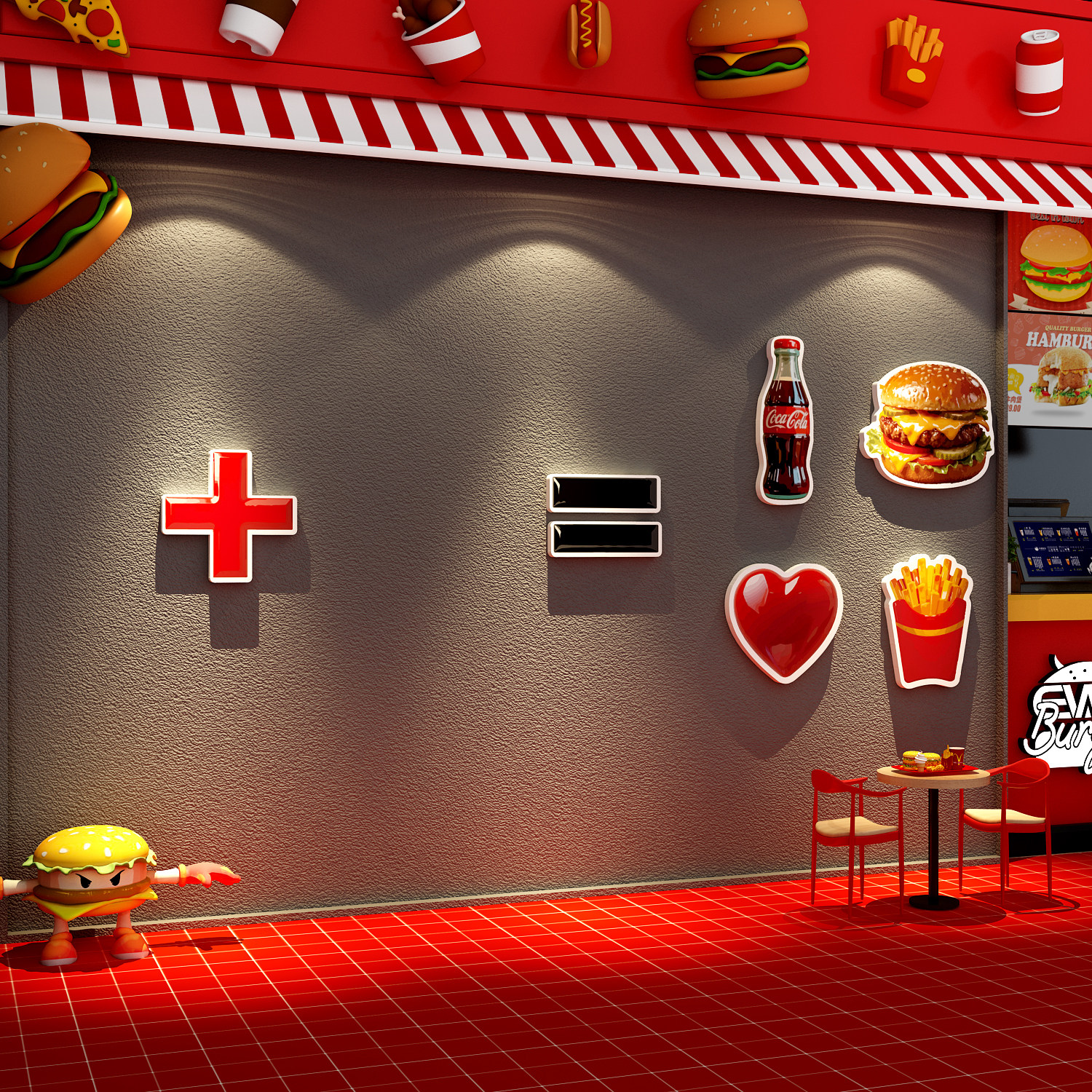 网红汉堡店薯条炸鸡进门头吸引人墙面装饰打卡拍照区氛围布置背景