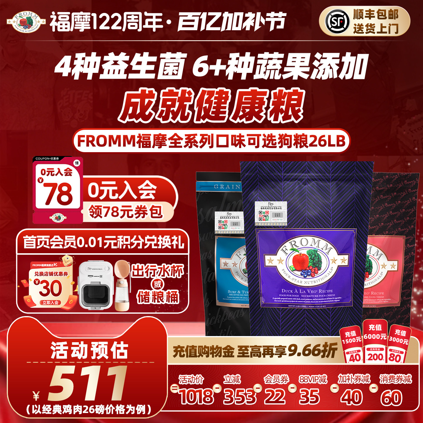 【官方旗舰店】Fromm福摩无谷猎鸟鸡鸭肉甜薯蔬果成幼犬狗粮26磅