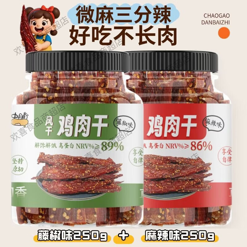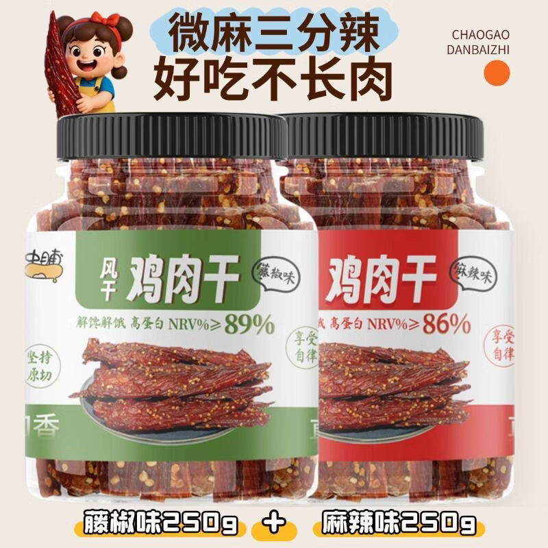 中脯新货鸡肉干风干鸡胸肉干麻辣半斤休闲小零食健身耐嚼即食250g 净含量250g每桶 麻辣1桶+藤椒1桶