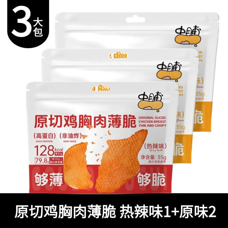 中脯新货原切鸡胸肉脆片高蛋鸡排脆健身代餐解馋小零食管理期宿舍 5g每袋配料表只有-鸡胸肉食用盐调味料 热辣味1包+原味2包