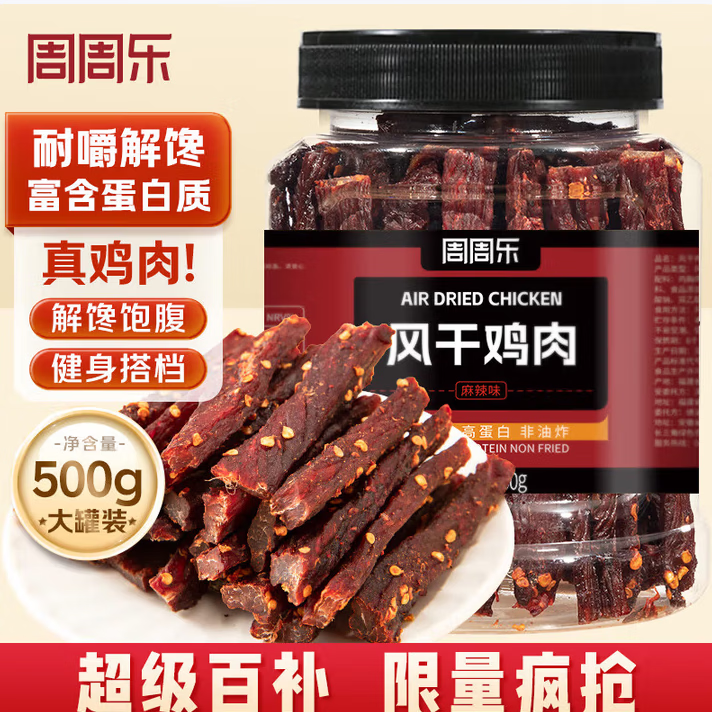 周周乐风干鸡胸肉干500g麻辣鸡肉干休闲解馋小零食 麻辣风干鸡胸肉条500g*1罐