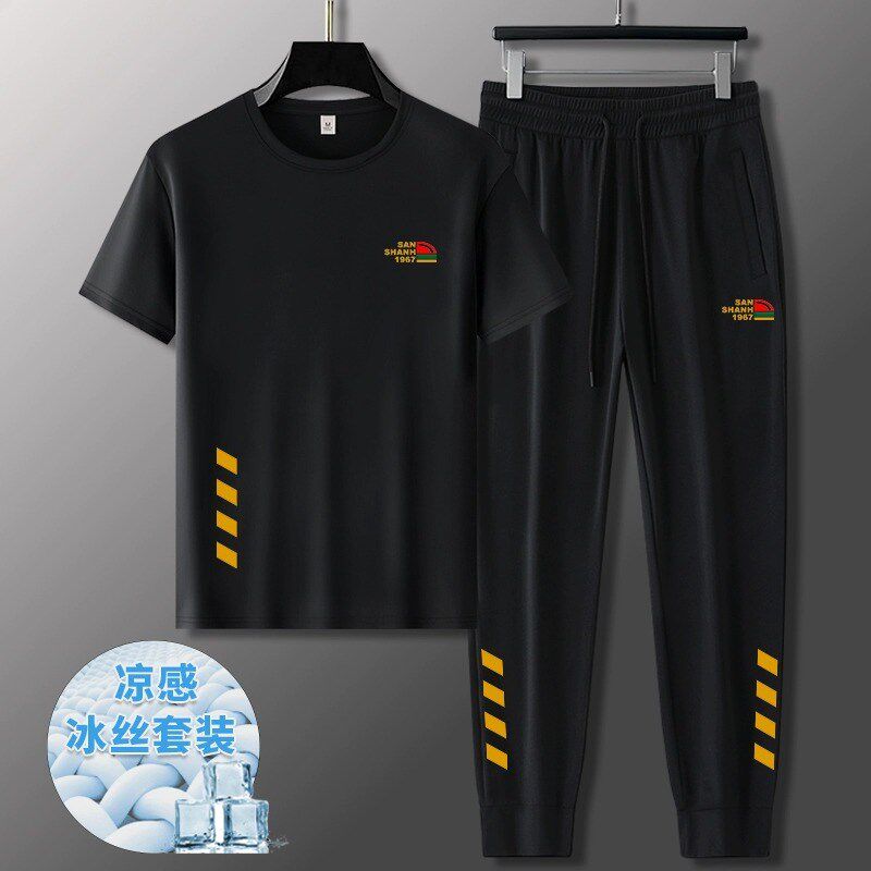 ~炒鸡舒适!冰丝休闲套装男夏季短袖T恤束脚长裤两件套潮