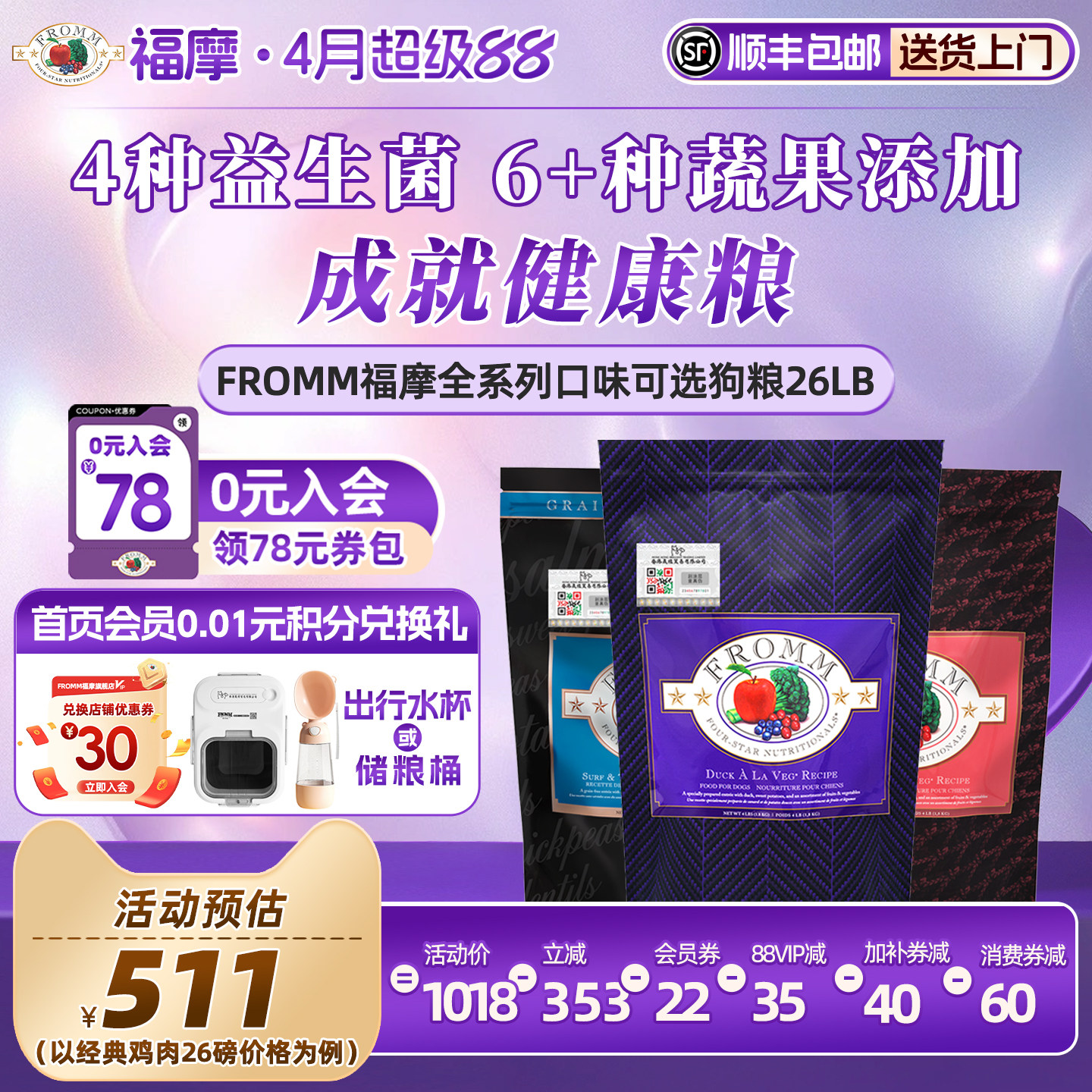【官方旗舰店】Fromm福摩无谷猎鸟鸡鸭肉甜薯蔬果成幼犬狗粮26磅
