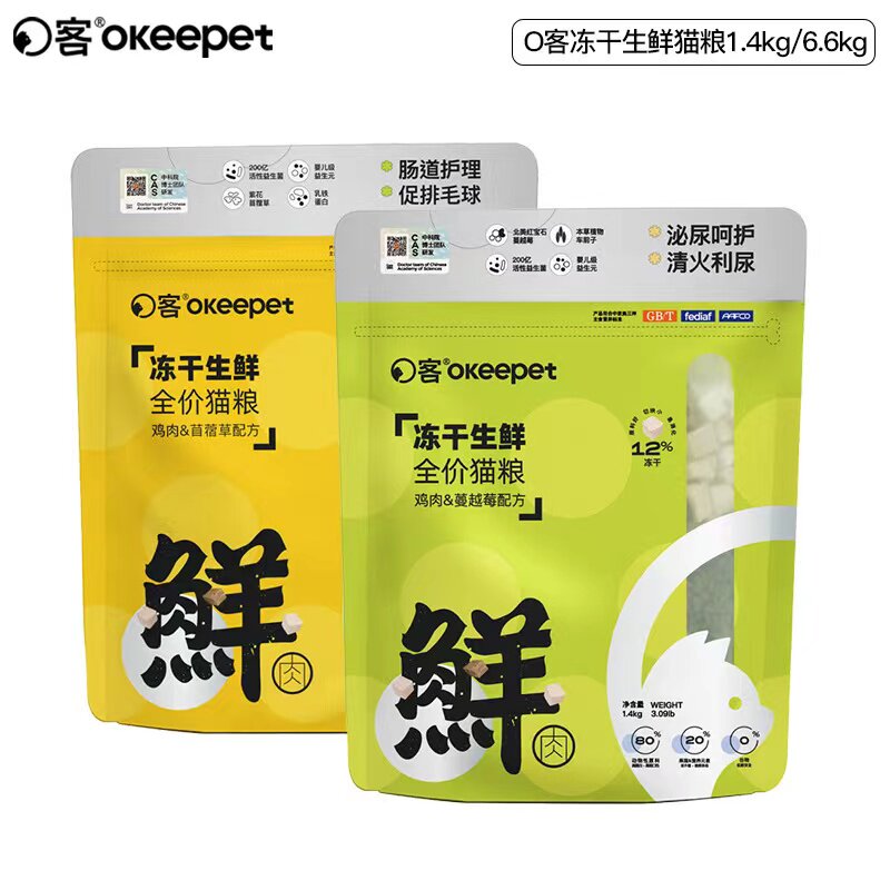 O客生鲜冻干烘焙猫粮幼成猫营养无谷全价鸡肉蔓越莓鱼呵护泌尿