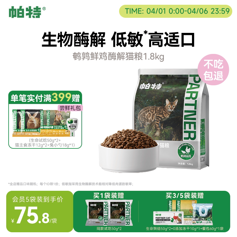 帕特纯粮酶解鲜鸡肉全价无谷猫粮成幼猫专用高适口鹌鹑配方1.8kg