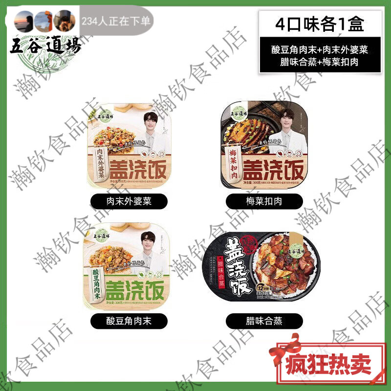 五谷道场方便自热饭批发焖鸡即食免煮快餐煲仔饭懒人食食品正品保障 4口味各1盒酸豆角+外婆菜+味+梅菜扣肉