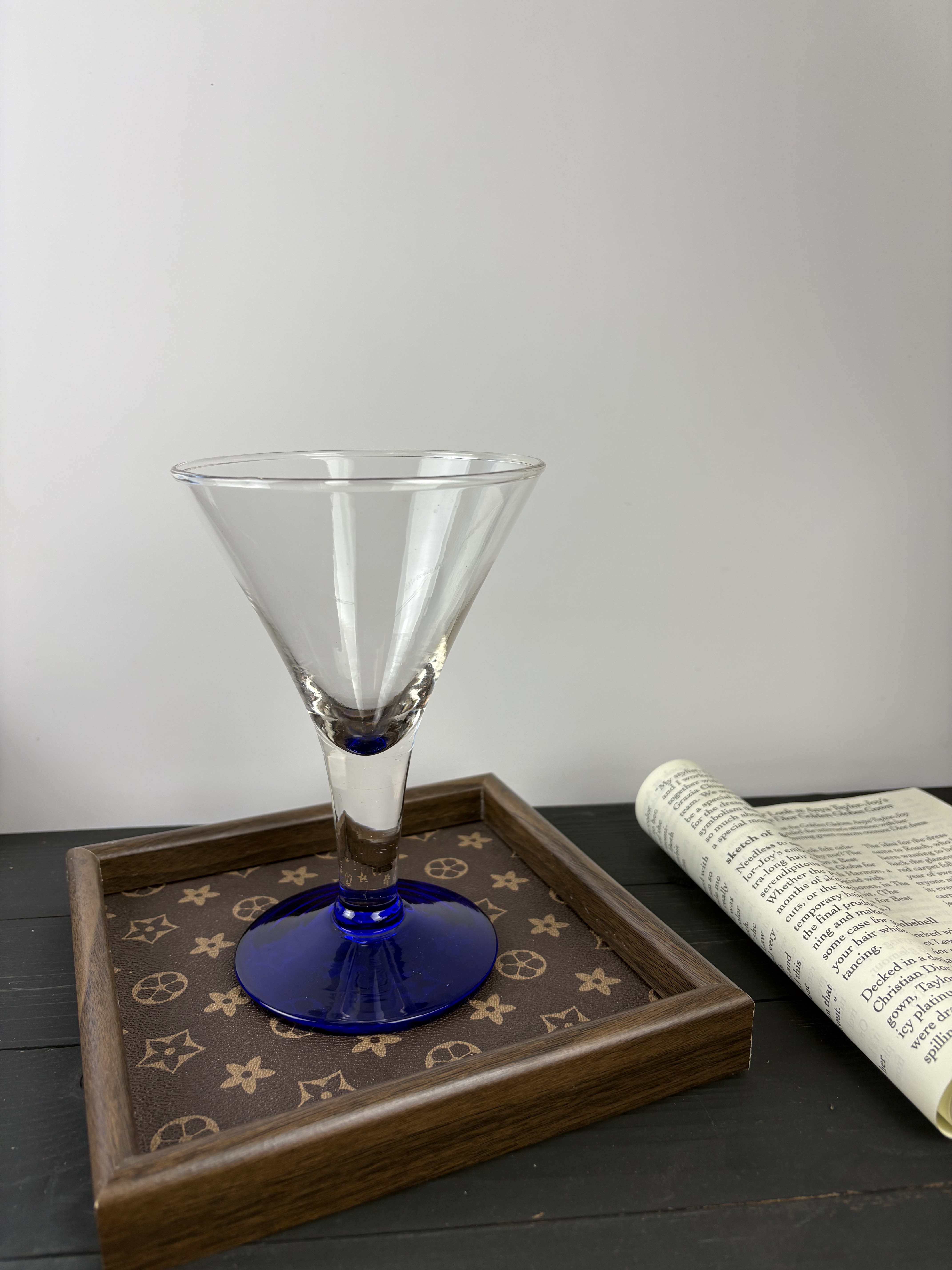 vintage中古克莱因蓝色拼色高脚杯加厚玻璃杯高脚杯鸡尾酒杯