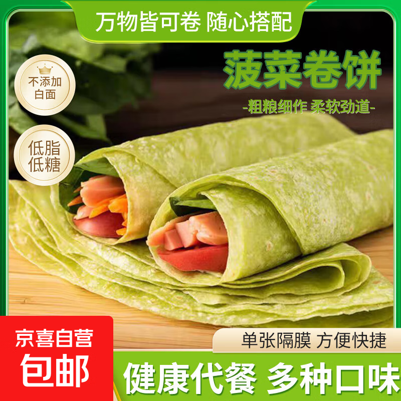 低脂轻食粗粮荞麦卷饼皮全麦卷饼鸡柳肉筋烤鸭饼皮卷饼速食早餐 菠菜粗粮卷饼【1斤】1袋约10张