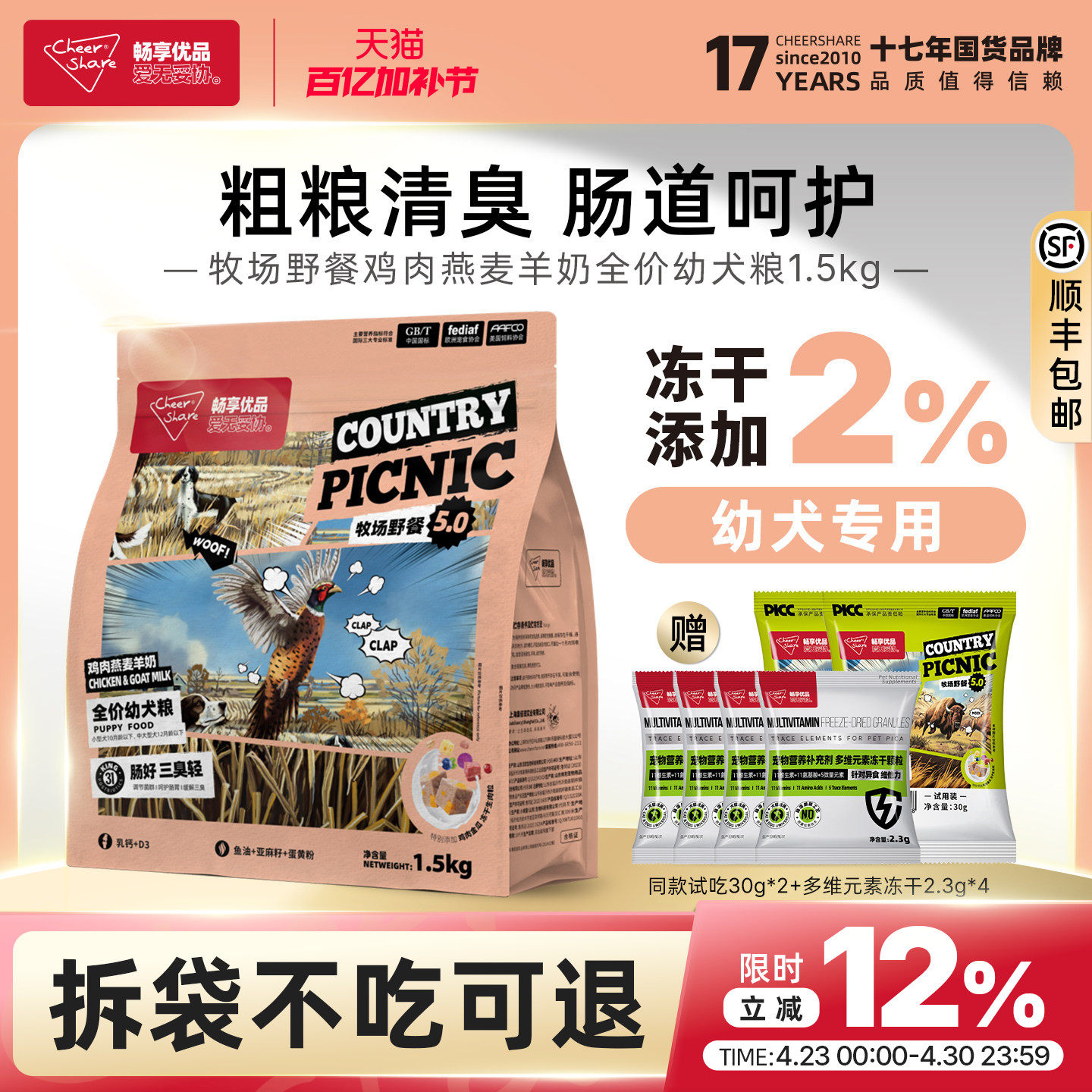 畅享优品牧场野餐5.0鸡肉燕麦羊奶冻干金毛拉布拉多幼犬狗粮1.5kg