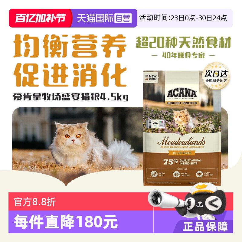 【自营】ACANA/爱肯拿鸡肉成幼猫牧场盛宴猫粮4.5KG增肌强健体格