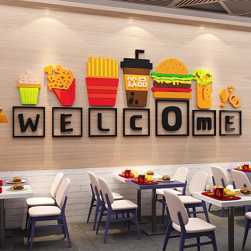 速发汉堡炸鸡店墙面装饰小吃餐饮店创意收银吧台布置宣传背景立体