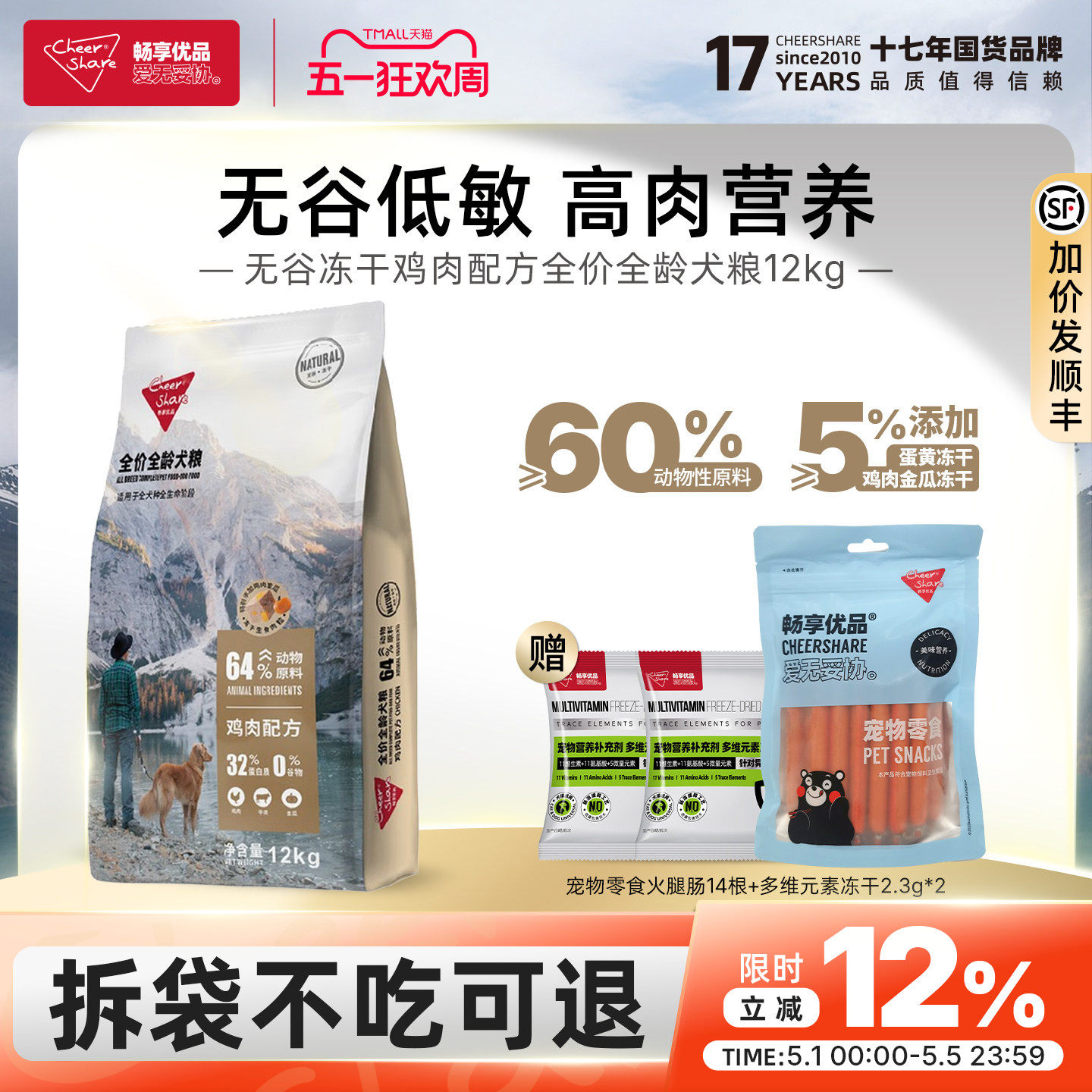 畅享优品鸡肉配方无谷低敏金毛泰迪柯基藏獒比熊冻干狗粮主食12kg