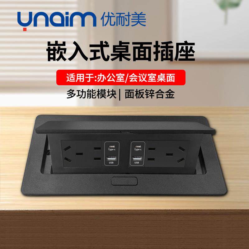 优耐美240型黑色办公室会议桌面插座黑色双五孔嵌入式USB网络插座
