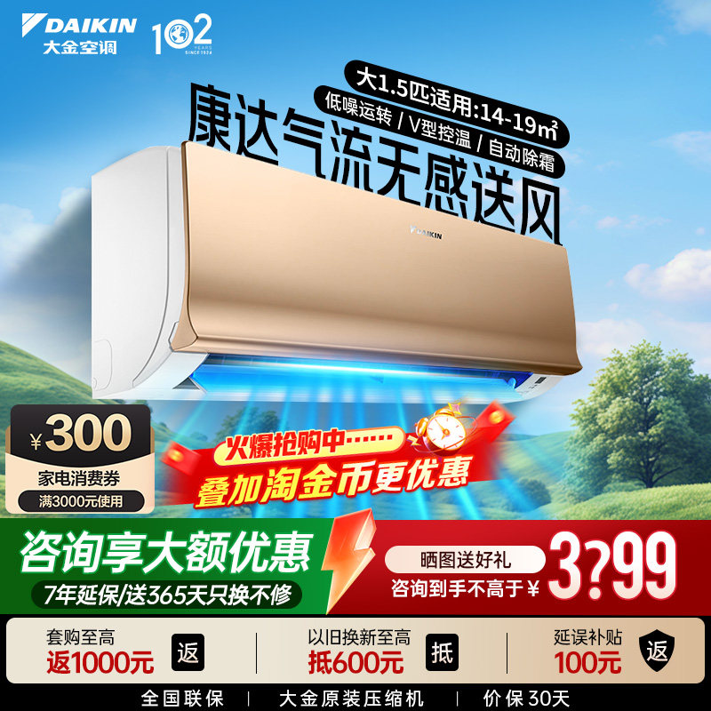 大金空调官旗大1.5匹变频康达气流家用冷暖挂机S336金色E-MAX7