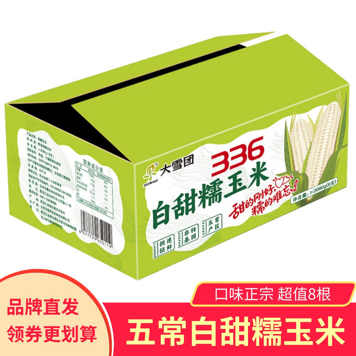 大雪团336五常白甜糯玉米东北苞米软糯香甜健康粗粮甜糯8根装