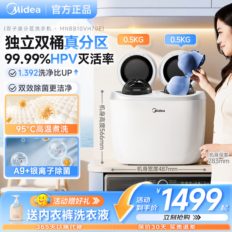 美的(Midea)双子座分区洗衣机 迷你小型全自动脱水内衣裤袜台式波轮双桶 高温煮洗除菌除螨 洗袜子机内裤机 双桶分区洗-MNBB10VH70E 双缸 1kg