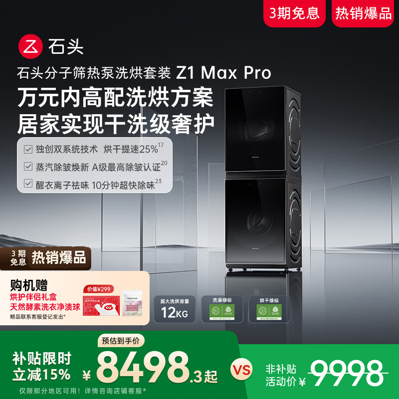 石头分子筛热泵洗烘套装Z1 Max Pro 黑曜石 12kg滚筒洗衣机+变频烘干机 洗烘双绿标 XQG120RRC32+RRG32