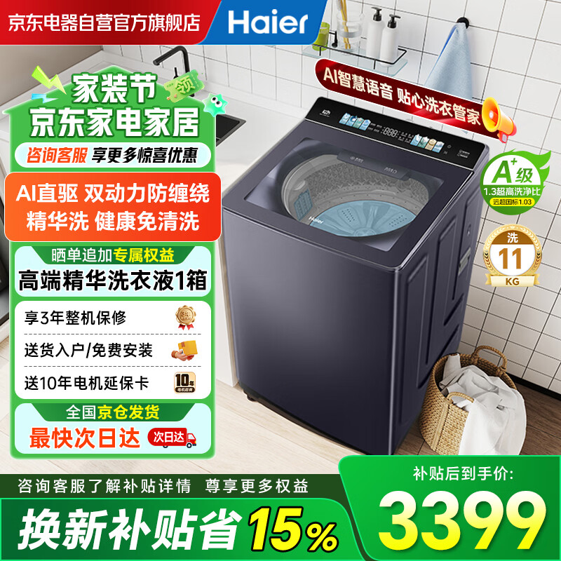 海尔(Haier)【云溪4.0波轮天花板】77E双动力免清洗洗衣机全自动 11公斤大容量直驱精华洗 XQS110-MBDE77EU1