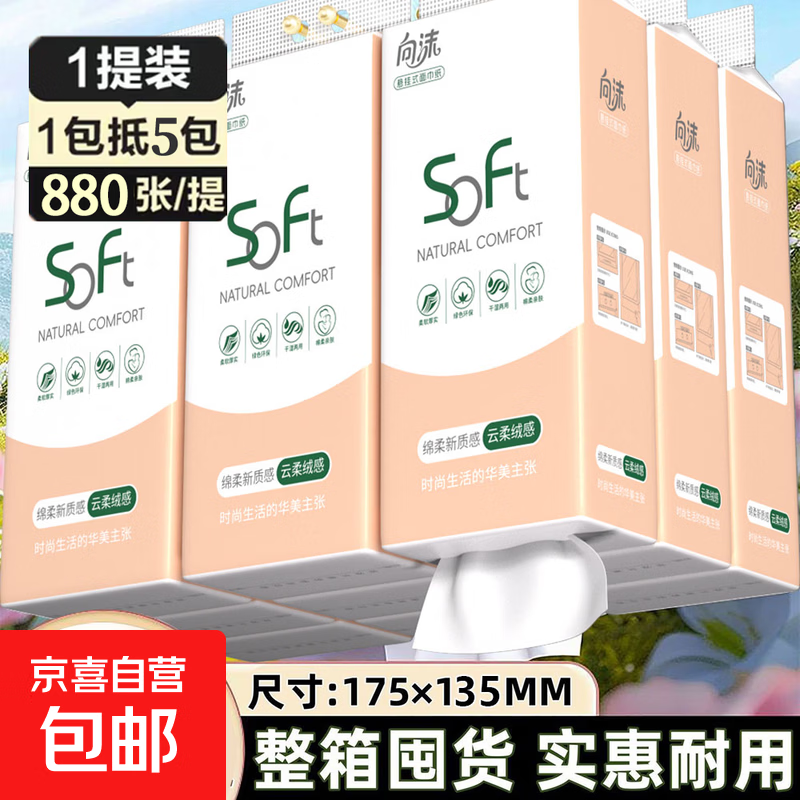 向沫悬挂式壁挂抽纸巾家用纸巾纸品挂卫生纸餐巾纸 原生木浆向沫粉白悬挂 4层 880张 * 1提 袋装