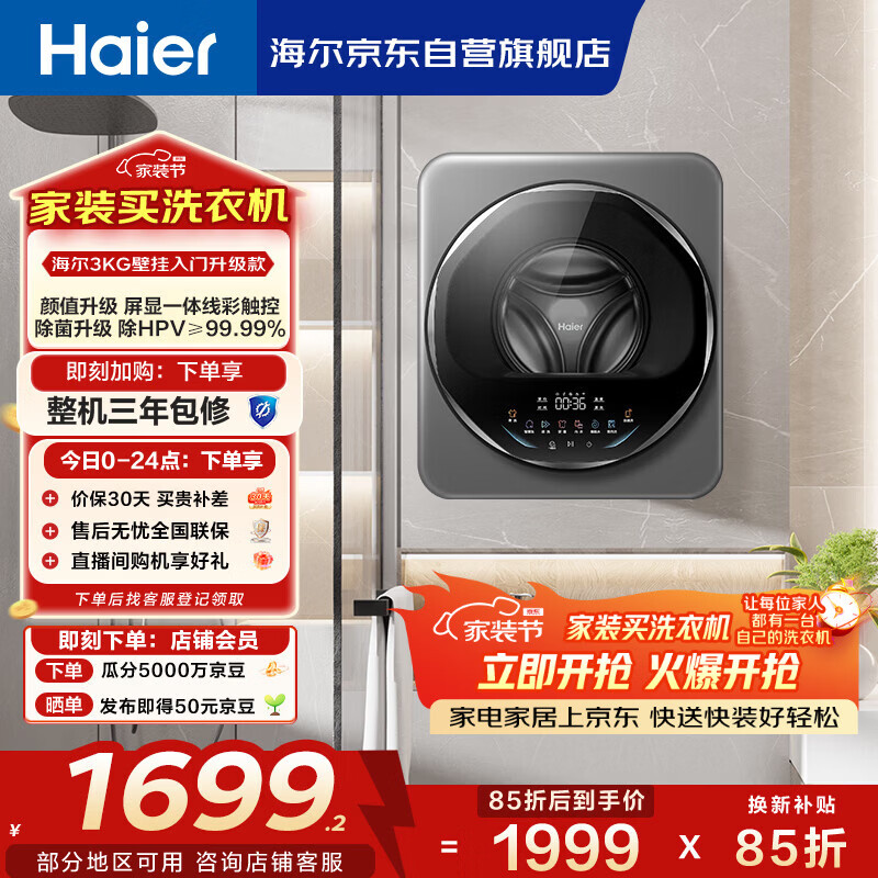 海尔(Haier)滚筒洗衣机全自动 3KG壁挂洗衣机 母婴迷你小型内衣裤洗 除HPV 焕新补贴XQG30-G68JU1