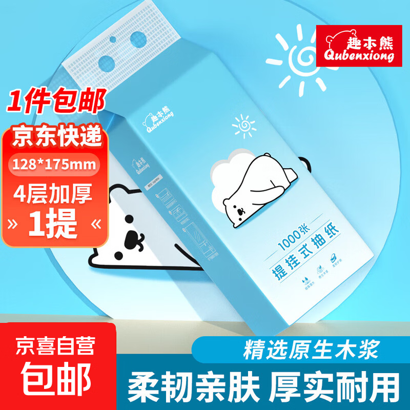 趣本熊4层加厚悬挂抽纸1000张原生木浆卫生纸厕所家用纸抽擦手纸 4层1000张*1提【尝鲜装】