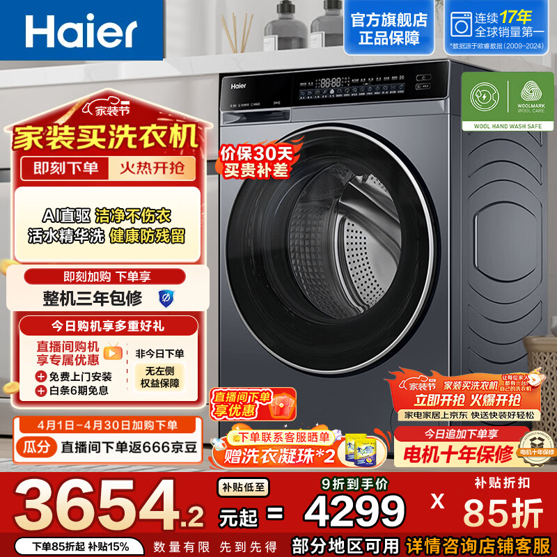 海尔(Haier)云溪4.0系列全自动滚筒洗衣机10KG家用 AI升级大容量直驱变频 双智投73K相似款 换新补贴582HU1