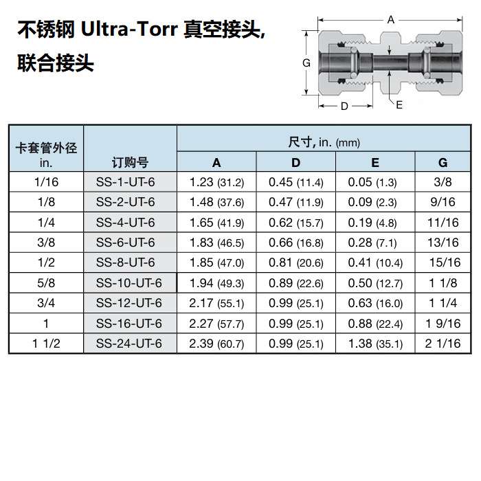 SS-4-UT-6世伟洛克Swagelok 不锈钢Ultra-Torr 真空管接头