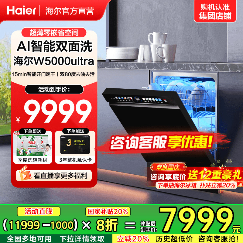 政府补贴海尔W5000ultra洗碗机双面洗大容量嵌入式家用全自动消毒