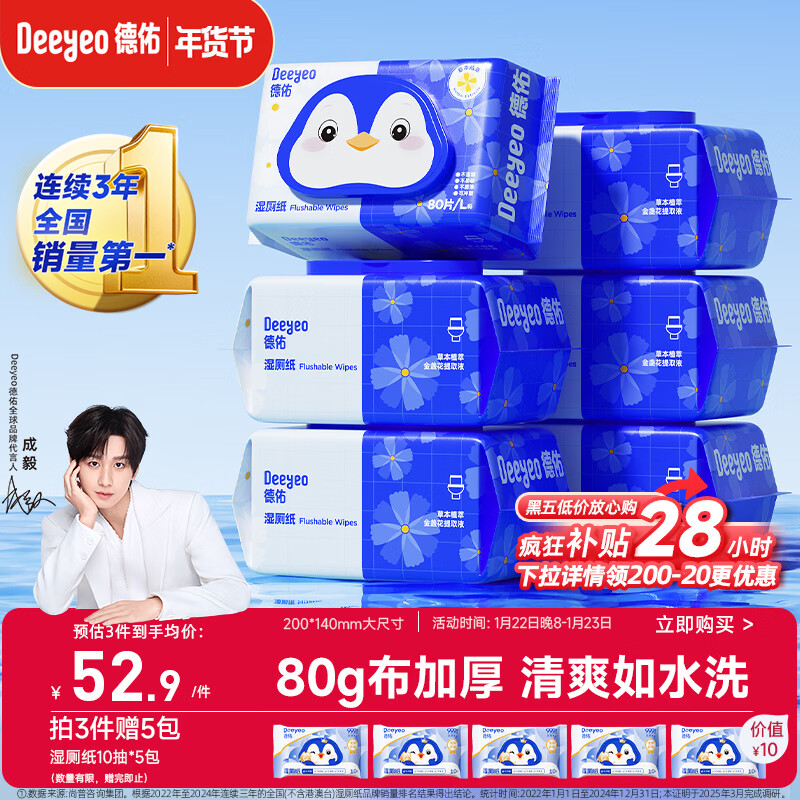 德佑湿厕纸家庭装80抽*6包 洁厕湿纸巾厕纸湿巾 可搭配卷纸可冲入马桶