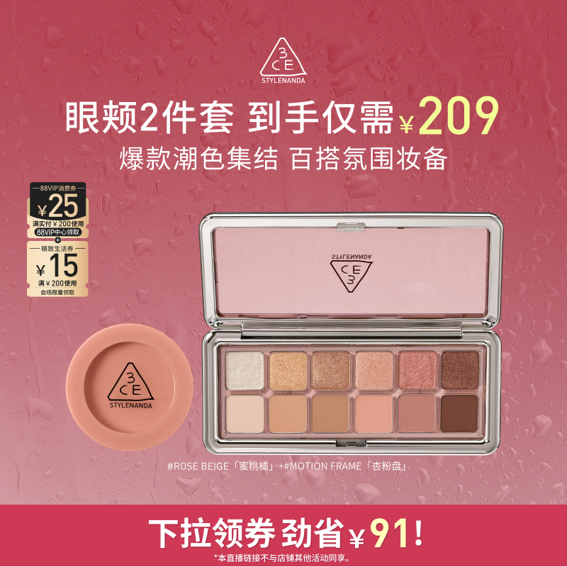 【达人直播】3CE十二色眼影腮红套装水泥杏粉盘裸粉色蜜桃橘NHO
