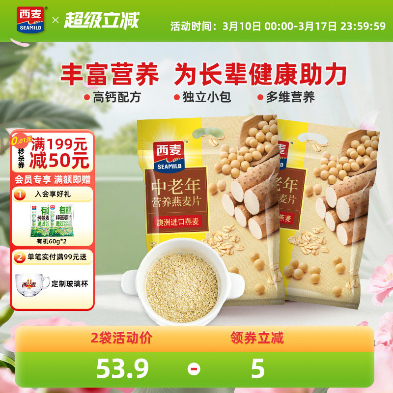 西麦中老年速溶燕麦片营养高钙700gx2袋原味0添加白砂糖早餐健康