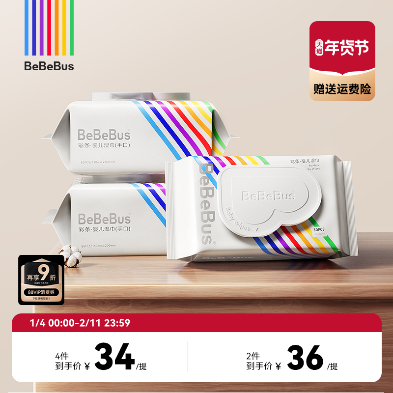 BeBeBus彩条婴儿湿纸巾手口屁新生幼儿家庭专用大包湿巾纸80抽3包