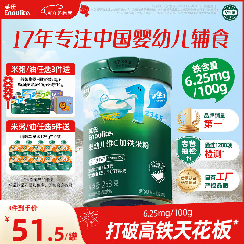 英氏婴幼儿高铁米粉糊维C加铁原味258g宝宝辅食低敏6-12个月老爸抽检