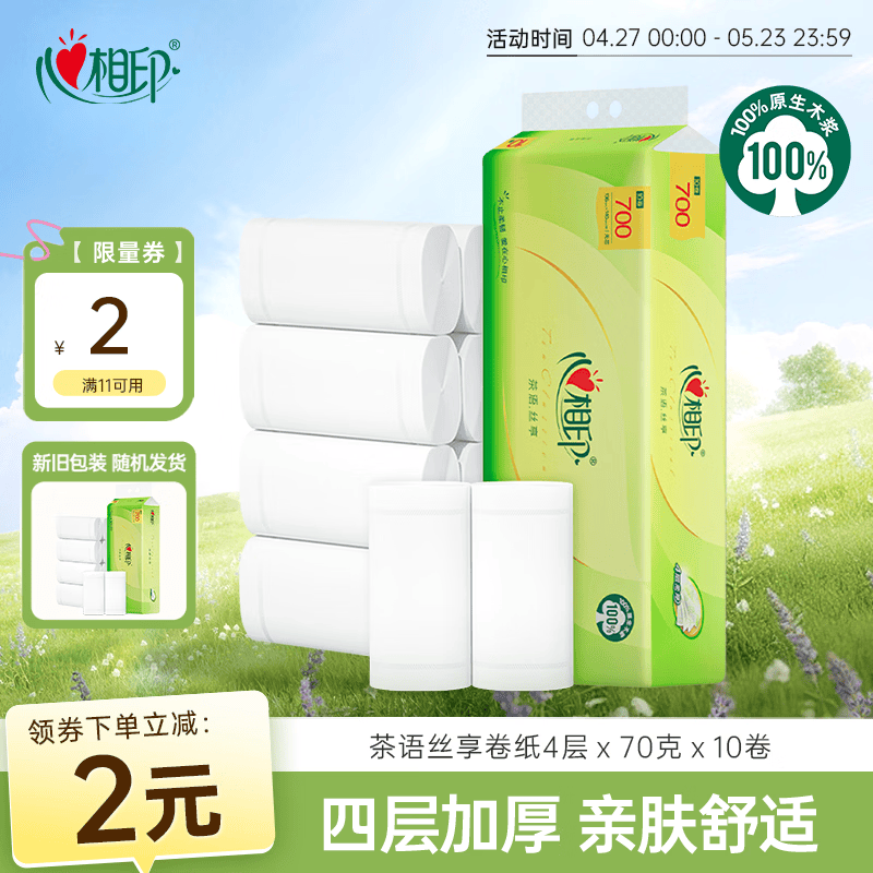 心相印无芯卷纸 丝享4层700克 柔厚亲肤 卫生纸 可冲散 原生木浆提装