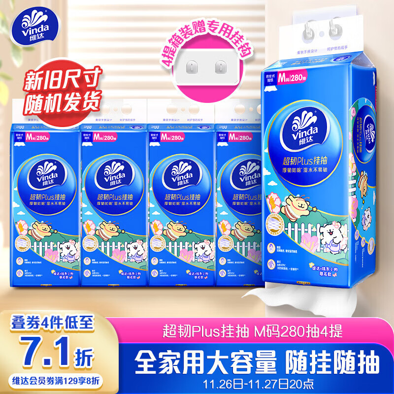 维达(Vinda)抽纸 超韧Plus挂抽3层280抽*4提M码 线条小狗 悬挂式纸巾 整箱