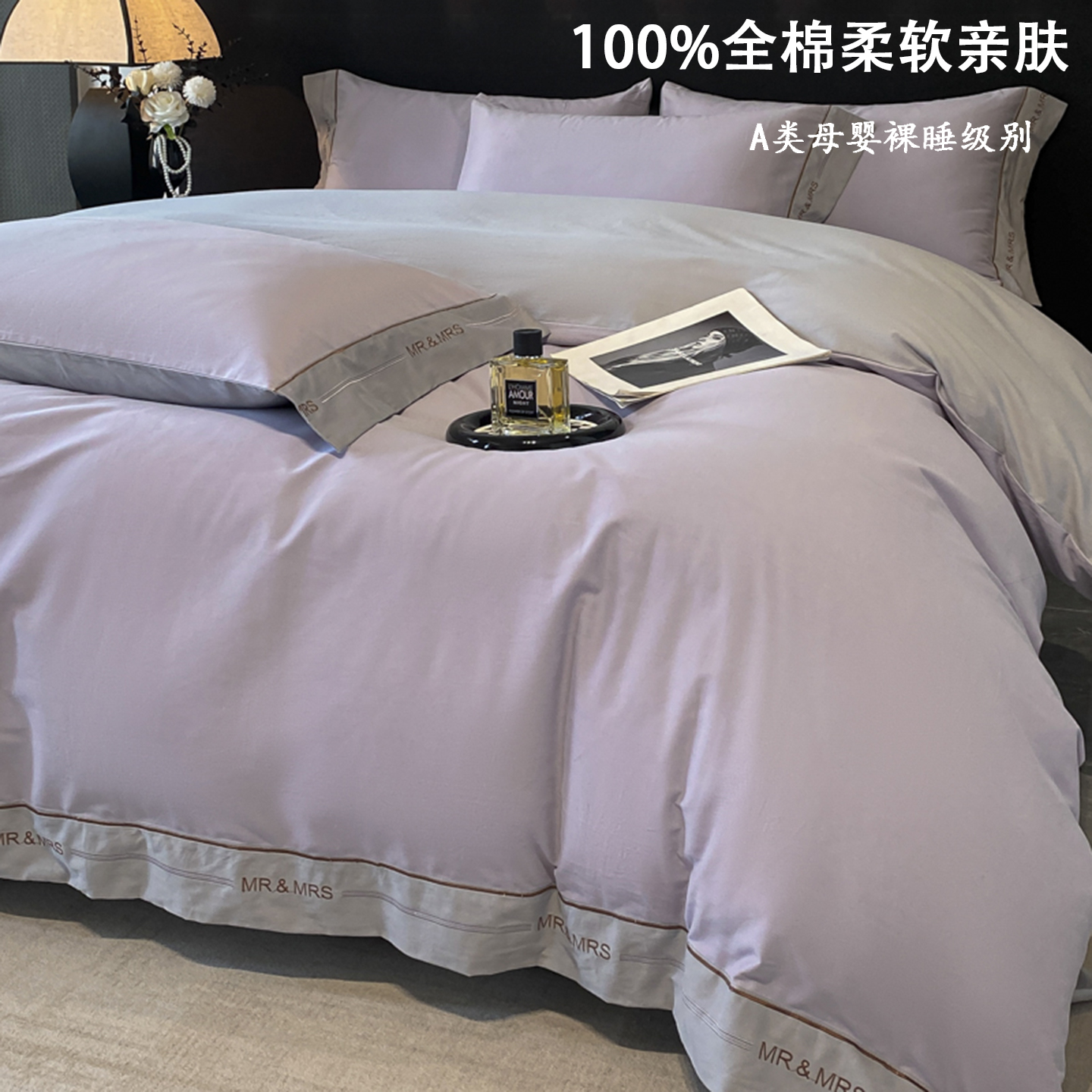 A类全棉磨毛四件套纯色简约轻奢高级感纯棉加厚被套春秋床单床品4