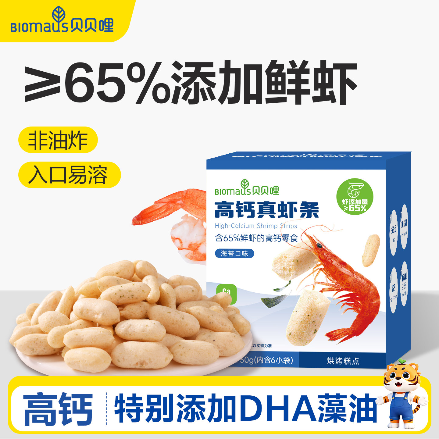 贝贝哩高钙虾条儿童健康小零食送宝宝婴幼儿一岁以上食谱无添加剂