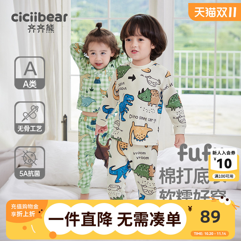 [fufu棉5A抗菌]齐齐熊宝宝秋衣秋裤套装男童纯棉A类内衣儿童保暖
