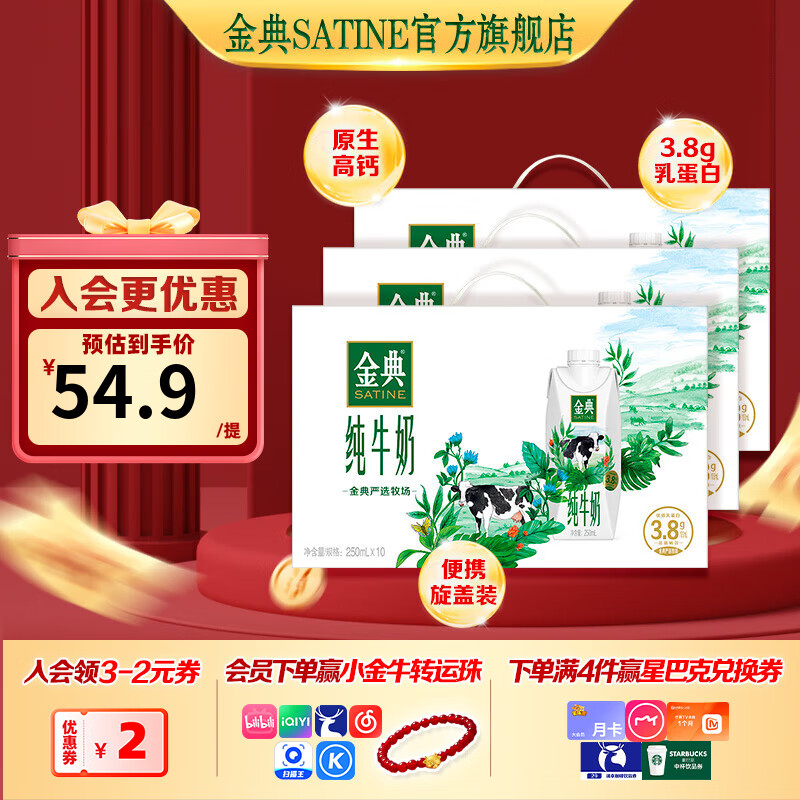 金典(SATINE)纯牛奶梦幻盖 3.8g乳蛋白 原生高钙 伊利牛奶整箱送礼 8月产 金典纯牛奶梦幻盖250ml*10盒*3箱