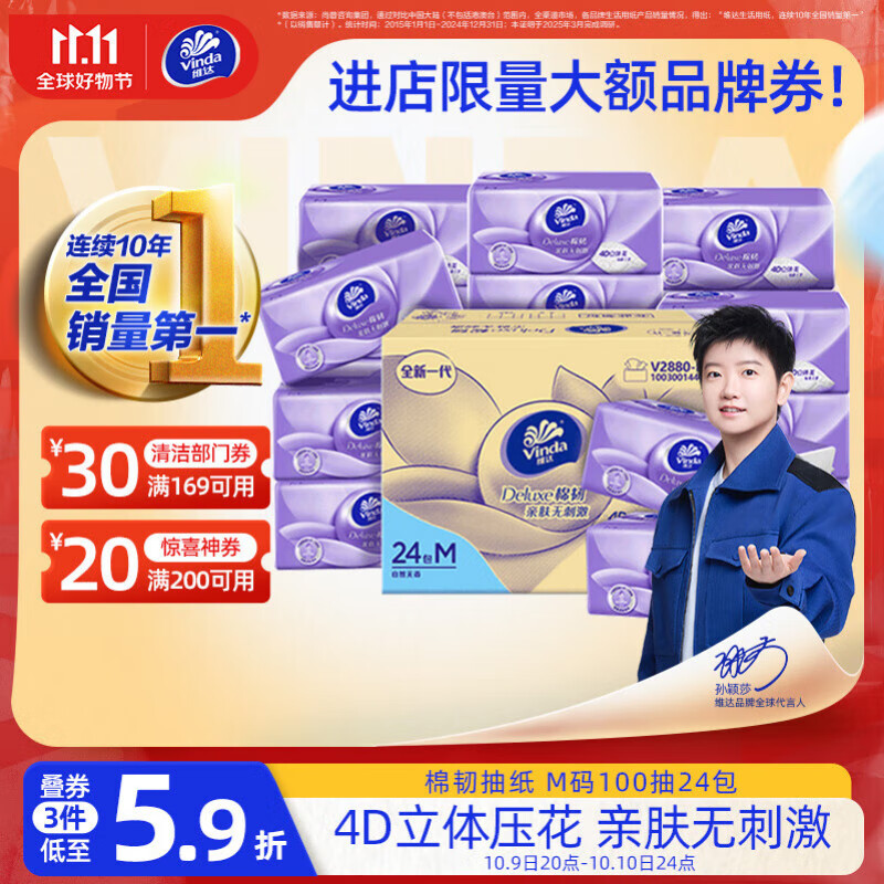 维达(Vinda)抽纸【孙颖莎推荐】棉韧3层100抽*24包M码 餐巾纸纸抽 纸巾 整箱
