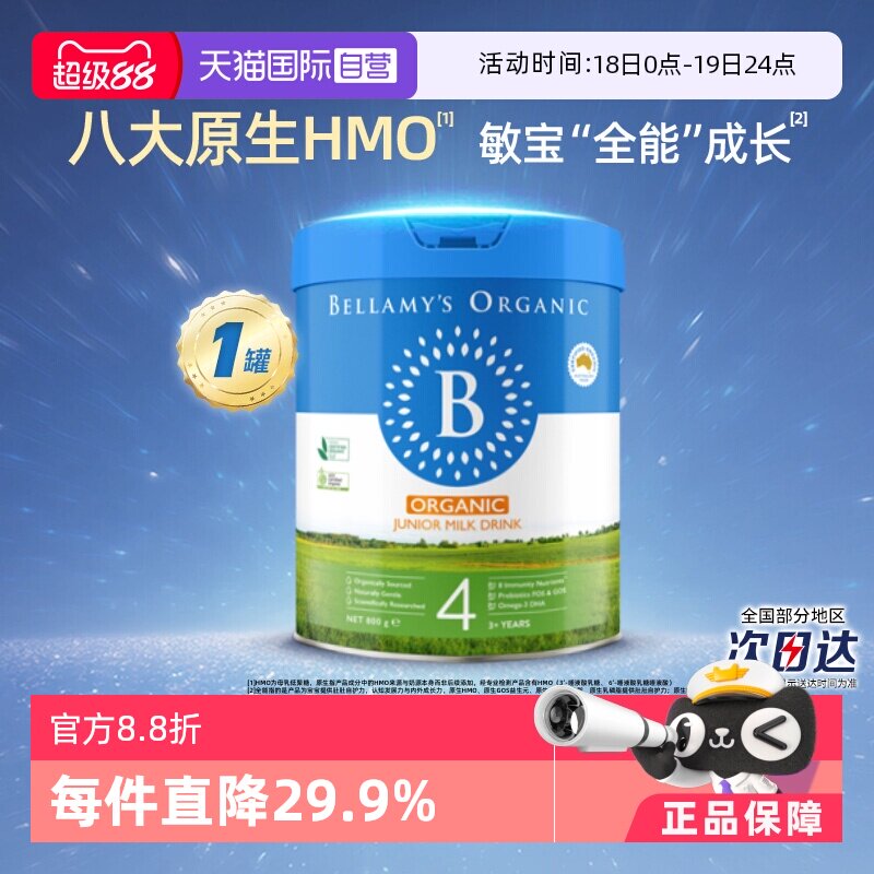 【自营】贝拉米经典2.0版HMO有机幼儿配方牛奶粉4段800g*1罐