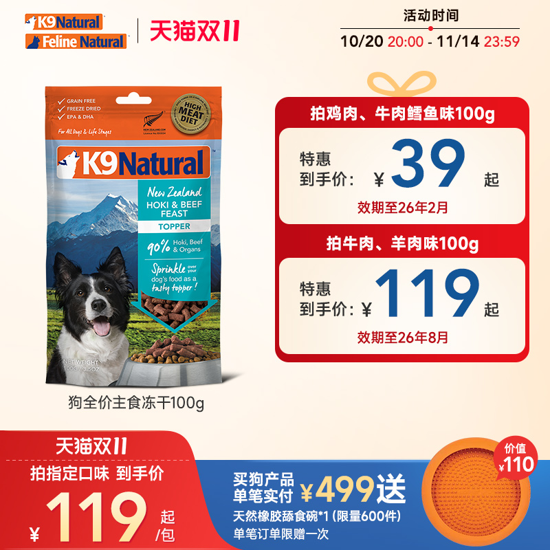 【临期特惠】K9Natural新西兰进口全价狗主食冻干粮无谷高肉犬粮