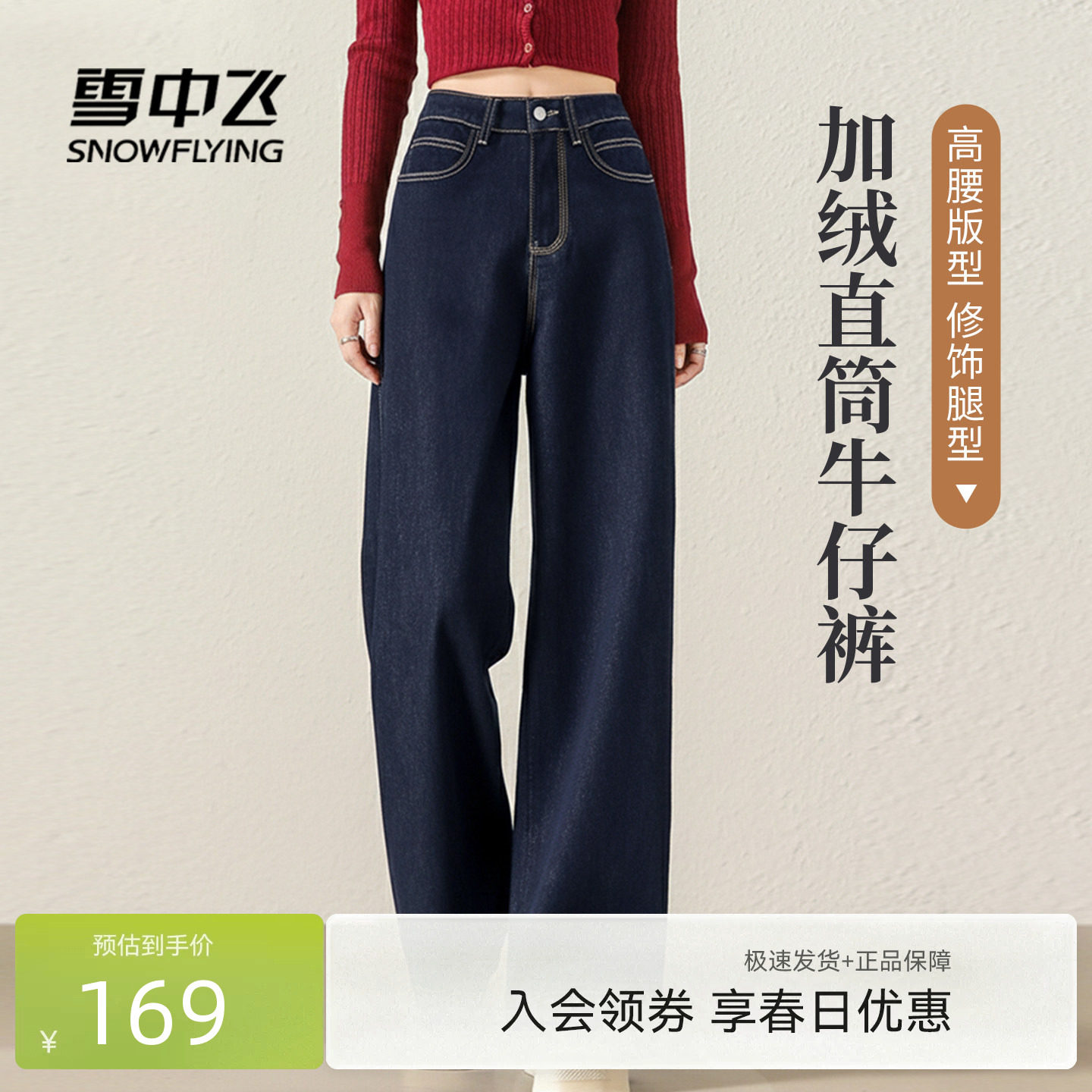 雪中飞加绒牛仔裤女春2026新款显瘦保暖直筒裤女士气质休闲裤子PC