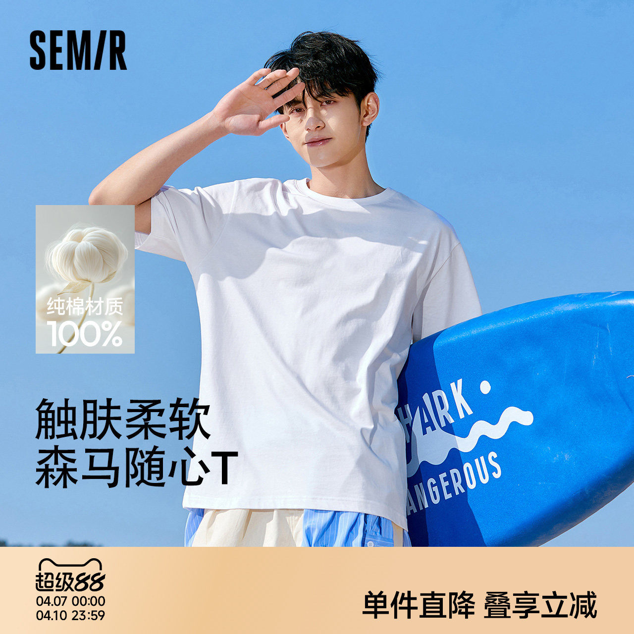 森马短袖T恤男装新款纯棉半袖情侣纯白圆领凉感白t休闲打底衫贴身