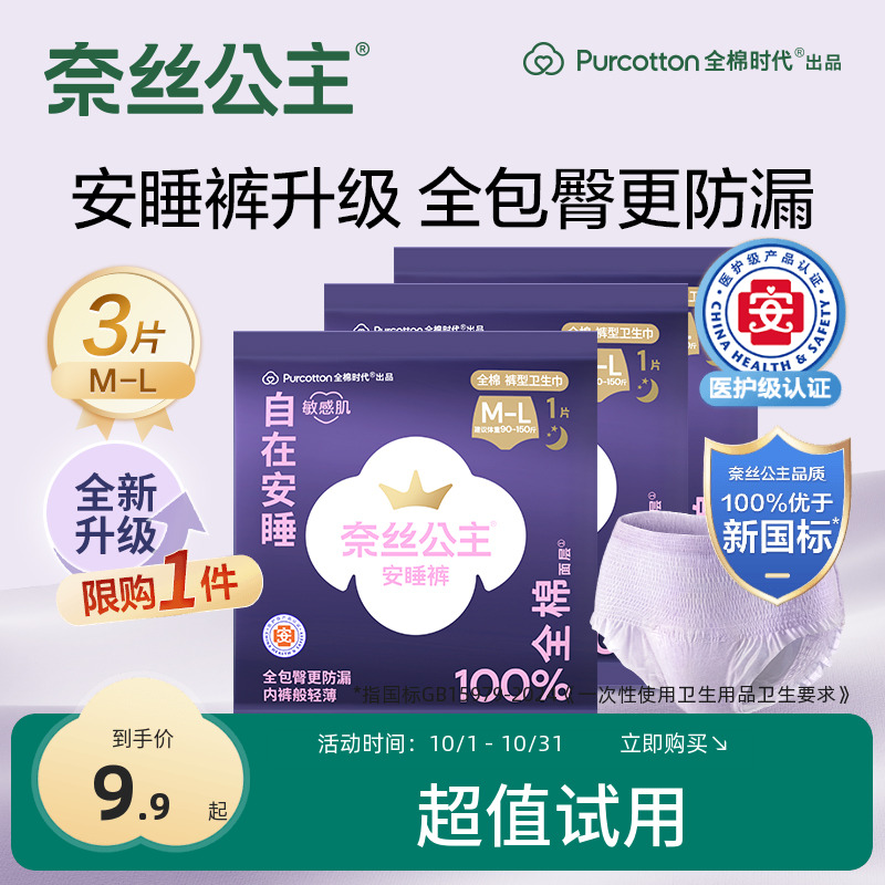 【超值试用】全棉时代奈丝公主医护级安睡裤安心裤夜用卫生巾3条